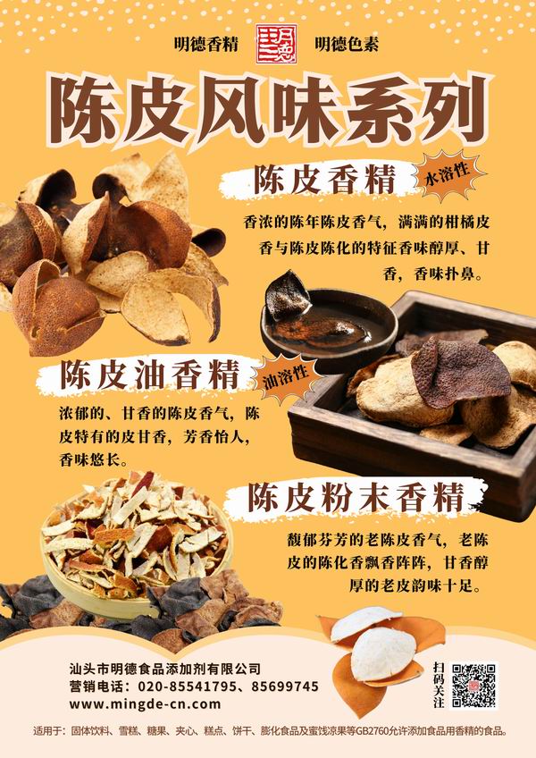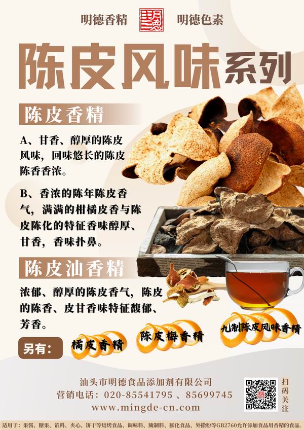 明德食品添加劑 緊跟市場潮流,應(yīng)運而生 推出了 陳皮香精。愿使各位食品生產(chǎn)廠家朋友們更好的在新風味浪潮中,占領(lǐng)市場先機優(yōu)勢,永立潮頭。