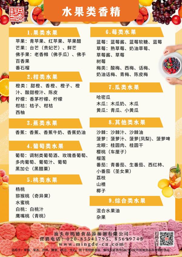 此外,汕頭市明德食品添加劑有限公司在數(shù)十年的研發(fā)中推出了眾多水果風味香精,從草莓、芒果、橙子 到 沙棘、佛手果、獼猴桃,應(yīng)有盡有。歡迎廠家們了解嘗試~